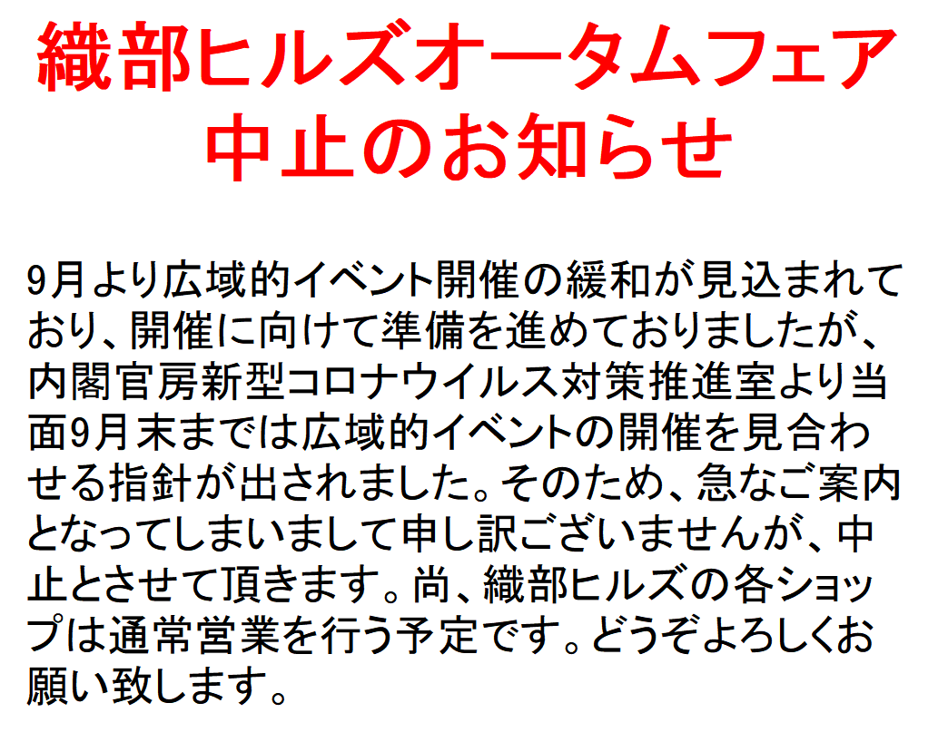 ニュース&イベント 織部ヒルズオータムフェア中止のお知らせ 2020.09.08|EVENT 9月19日・20日開催予定でした織部ヒルズオータムフェア2020ですが、中止させて頂くこととなりました。 急なご案内となってしまいまして、大変申し訳ございませんがご理解下さいますようお願い申し上げます。 尚、各ショップは通常営業を行う予定です。 どうぞよろしくお願い致します。 ◀◀︎ ニュース一覧へ