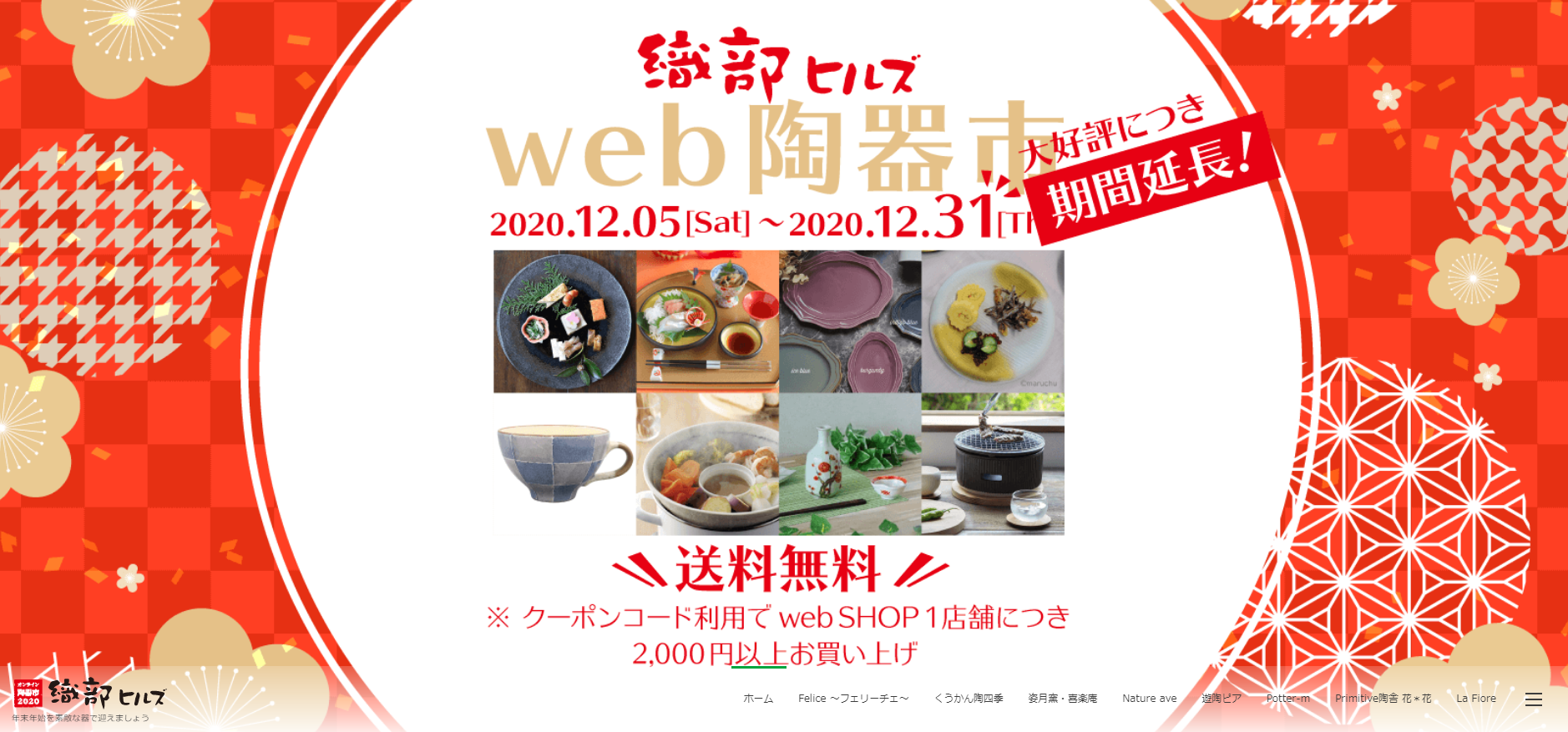 ニュース&イベント 【12月31日まで送料無料】冬のweb陶器市 2020.12.21|NEWS 1ショップで2,000円(税抜)以上ご購入で送料無料キャンペーン実施中 イベントサイトは https://oribe-hills.mino-pride.jp/event/ ◀◀︎ ニュース一覧へ