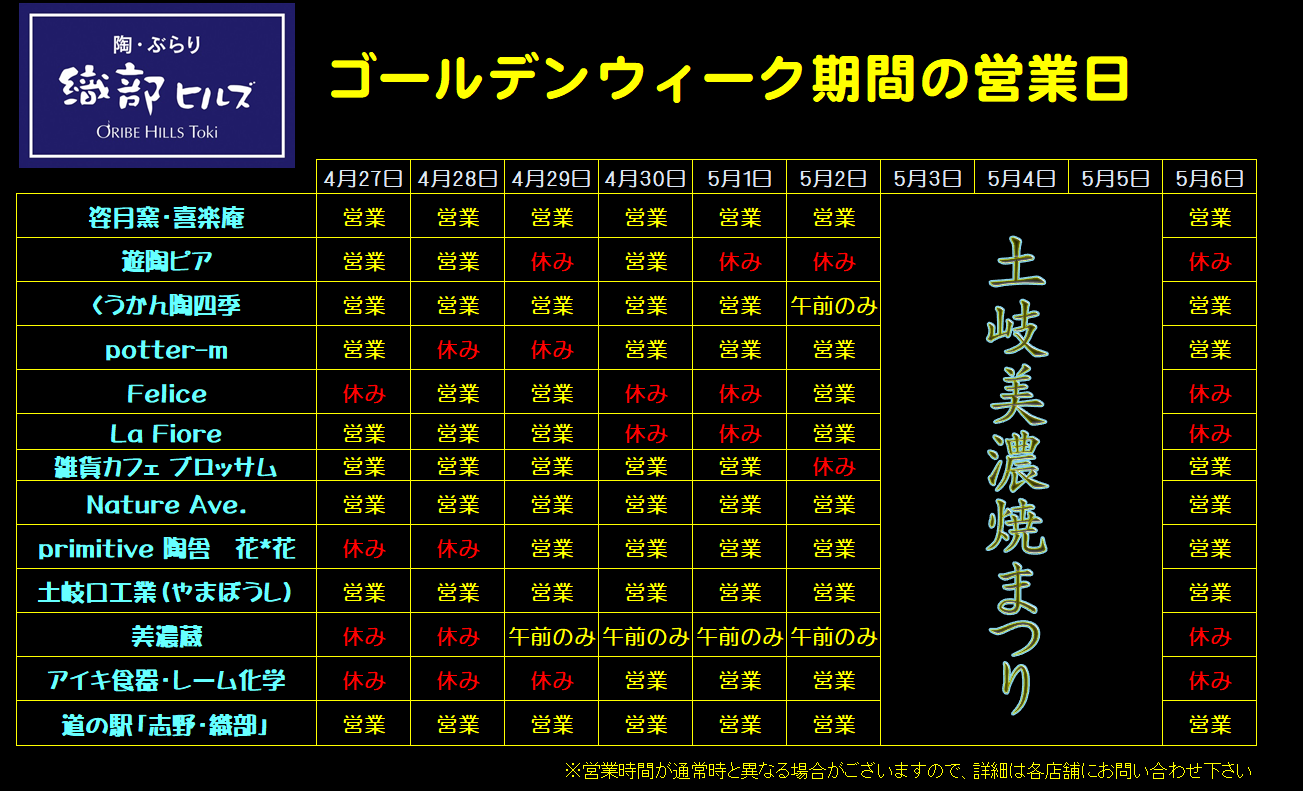 GW期間中の各ショップ営業日
