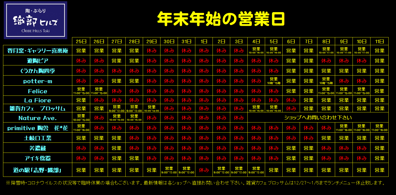 ニュース&イベント 年末年始の営業日時 2021.12.02|NEWS Nature Aveさん26日はお休みです(12月3日追記) La fioreさん25日営業に変更となりました(12月7日追記) ◀◀︎ ニュース一覧へ