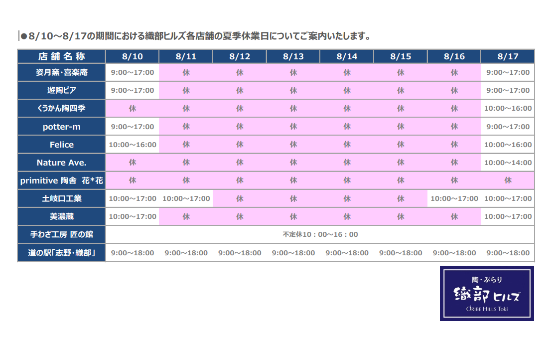 ニュース&イベント 織部ヒルズ各ショップの夏季休業日のご案内 2023.07.13|NEWS 8/10~8/17までの期間における織部ヒルズの各ショップ、道の駅などの夏季休業日について、以下のとおりご案内いたします。 ◀◀︎ ニュース一覧へ