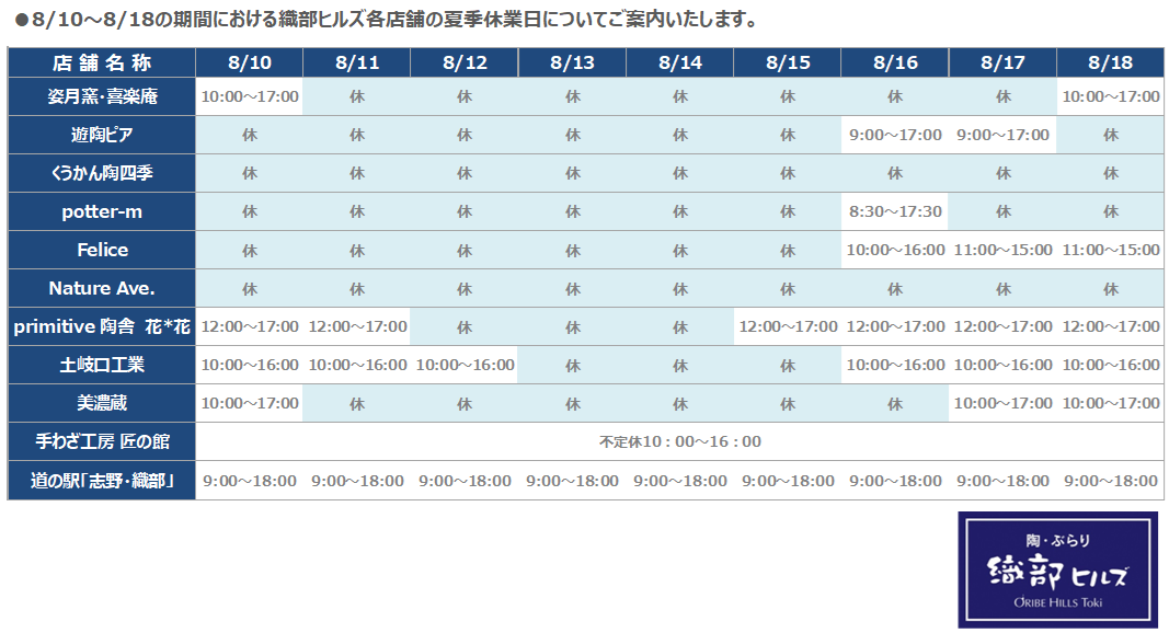 ニュース&イベント 織部ヒルズ 各ショップの夏季休業日について 2024.08.01|NEWS 織部ヒルズ各ショップの夏季休業日(8/10~8/18の期間)についてご案内いたします。 ◀◀︎ ニュース一覧へ