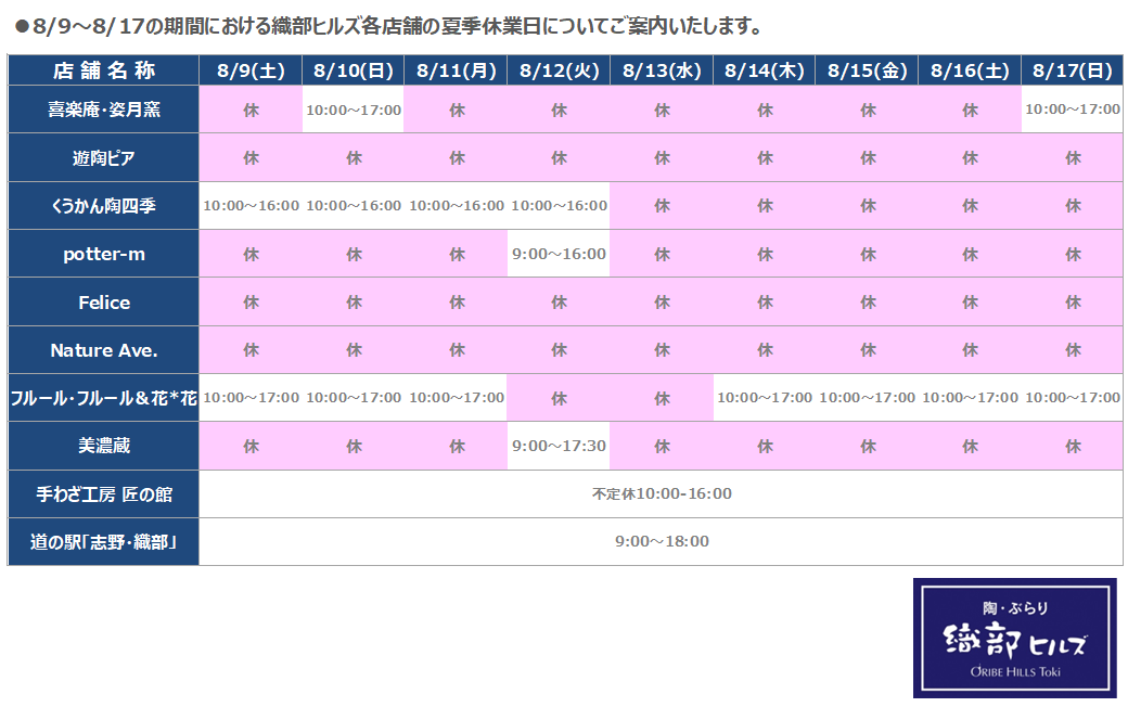 ニュース&イベント 織部ヒルズ 各ショップの夏季休業日について 2025.08.02|NEWS 織部ヒルズ各ショップの夏季休業日(8/9~8/17の期間)についてご案内いたします。 ◀◀︎ ニュース一覧へ