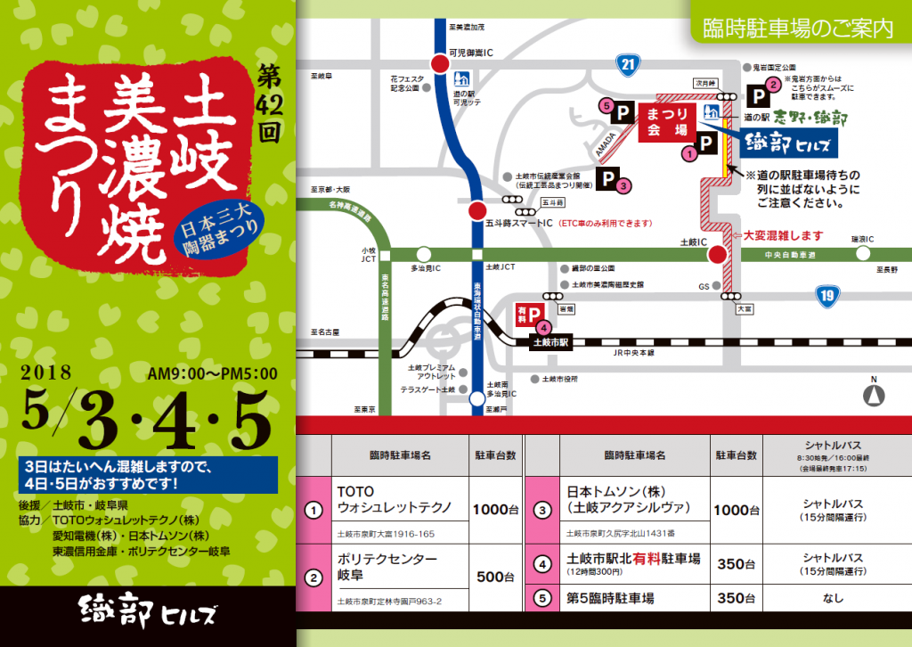 ニュース&イベント 第42回土岐美濃焼まつり臨時駐車場のご案内 2018.03.29|EVENT 雨天時・降雨後は駐車台数が大幅に減少する場合がございます。会場内への入場は朝7時より、会場の北側(21号線沿いの入場口からは進入できません)からのみ進入可能となりますので、ご注意下さい。 ◀◀︎ ニュース一覧へ