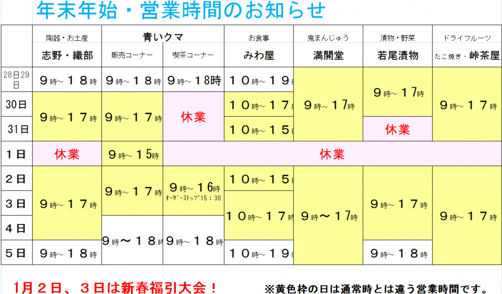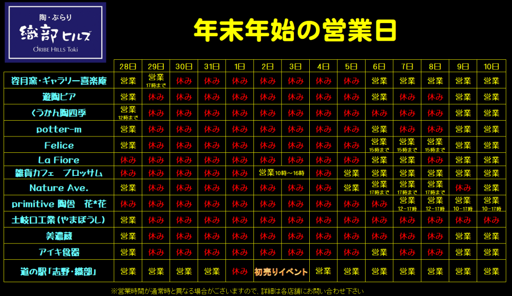 ニュース&イベント 年末年始営業日 2017.12.05|INFO. 年末年始はほとんどのショップがお休み致しますので、ご注意下さい。 また織部ヒルズ事務局は12月29日~1月8日まで年末年始休暇させて頂きます。 メールなどのお問合せは年明け営業日以降となります、ご迷惑をおかけいたしますが どうぞ、よろしくお願い致します。 皆様、良いお年を。 隣接する道の駅「志野・織部」及びテナント各店は下記の営業日時でございます。 ◀◀︎ ニュース一覧へ